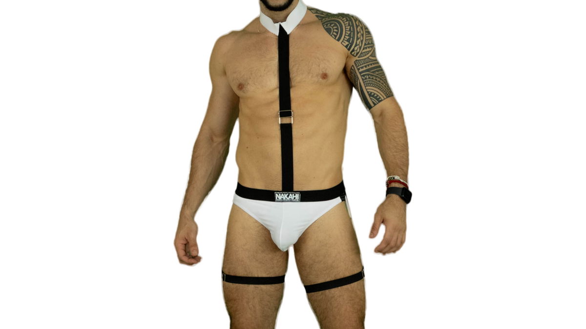 Combinación elegante de arnes elastico negro y blanco regulable, más slip de laycra Nakahi de calce perfecto, anatómico al cuerpo, liviana y muy cómodo.